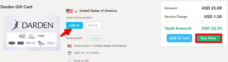 Get your Darden eGift Cards and all other gift cards online from al giftcards. Buying a gift card is easy and is a great way to express love, care and gratitude. Enter a few personal information of the receiver, like the name and email ID and instantly send the gift via email. Choose the Darden Gift Cards value from the available denominations of USD 25 and USD 50. On Darden gift card activation, this gift card is valid for 12 months, thus giving you a year's time to spend it before its expiry.